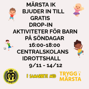Kom och ha kul med Märsta IK! Drop-in-sport och roliga aktiviteter för barn ett gäng söndagar under hösten. Helt gratis och öppet för alla som vill vara med. Aktiviteterna anordnas av Märsta IK i samarbete med Trygg i Märsta.